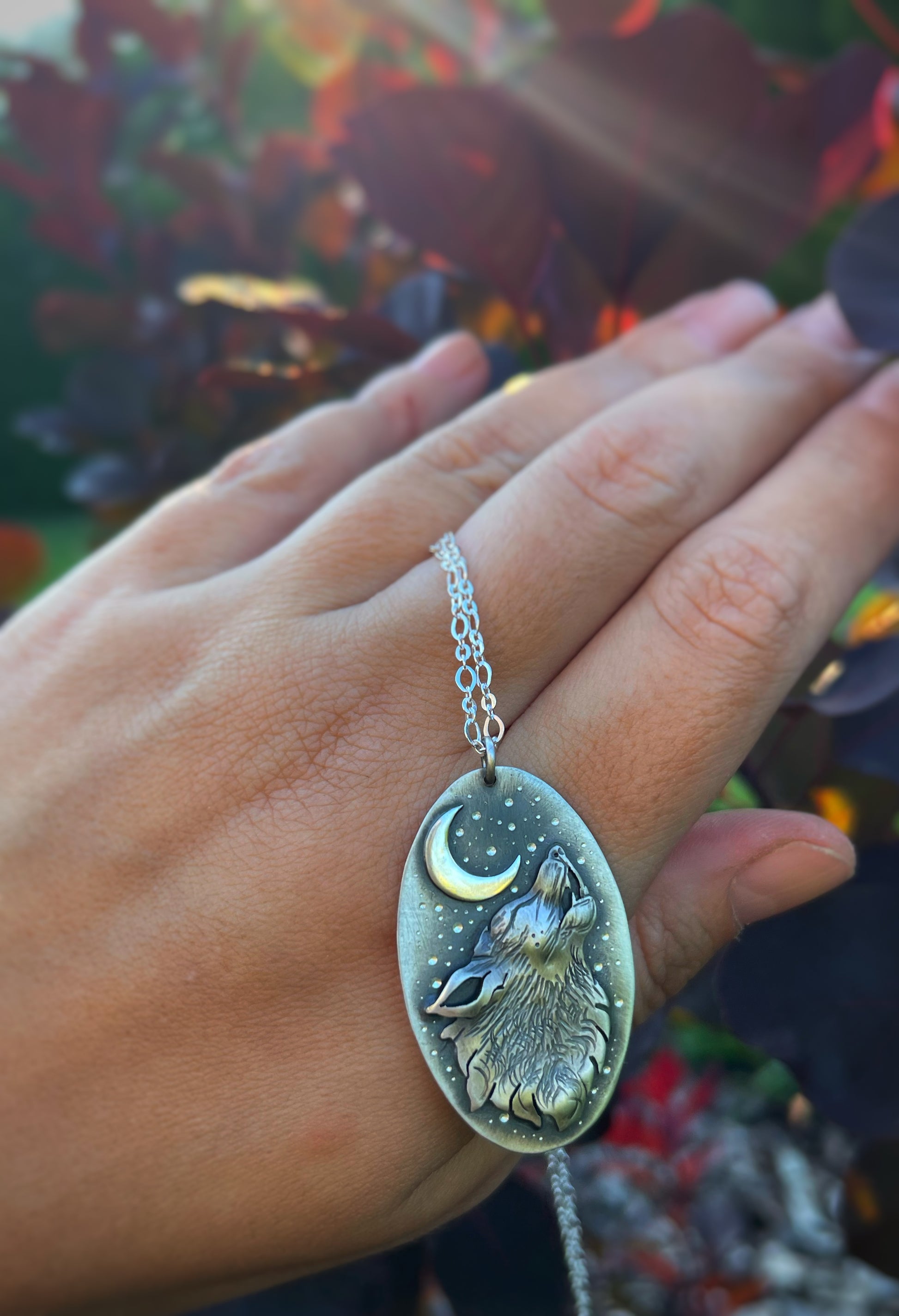 Made by hand in every bit and detail. Beautifully shaped and pierced wolf has been placed on an additional bed of silver. Adorned with stars and crescent moon.