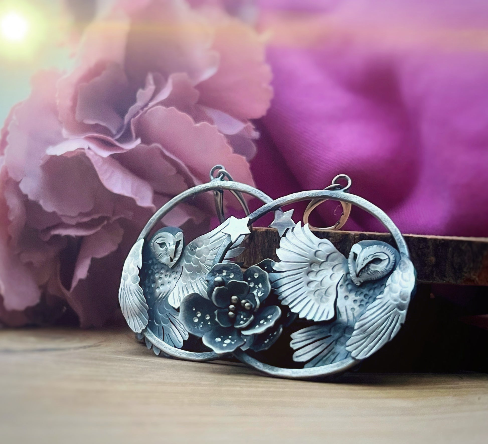 So here they come. Super intricate hand sawnformed and decorated owls on larger hoops. The flower and a star.